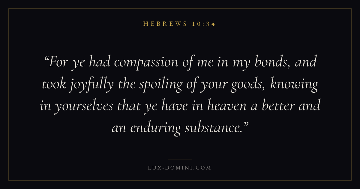 For ye had compassion of me in my bonds, and took joyfully the spoiling of your goods, knowing in yourselves that ye have in heaven a better and an enduring substance.