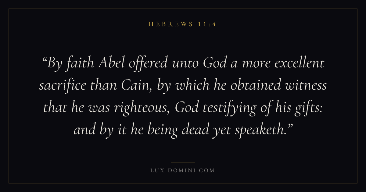 By faith Abel offered unto God a more excellent sacrifice than Cain, by which he obtained witness that he was righteous, God testifying of his gifts: and by it he being dead yet speaketh.