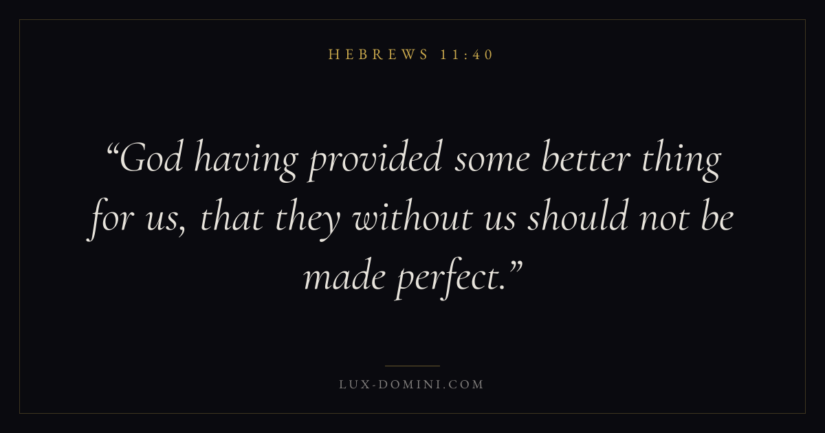 God having provided some better thing for us - Margin, "foreseen." That is, "God having provided, or determined on giving some better thing than any of them realized, and which we are now permitted to enjoy." That is, God gave them promises; but they were not allowed to see their fulfillment. We are permitted now to see what they referred to, and in part, at least, to witness their completion; and though the promise was made to them, the fulfillment more particularly pertains to us. That they without us should not be made perfect - That is, complete. The whole system of revelation was not complete at once, or in one generation.