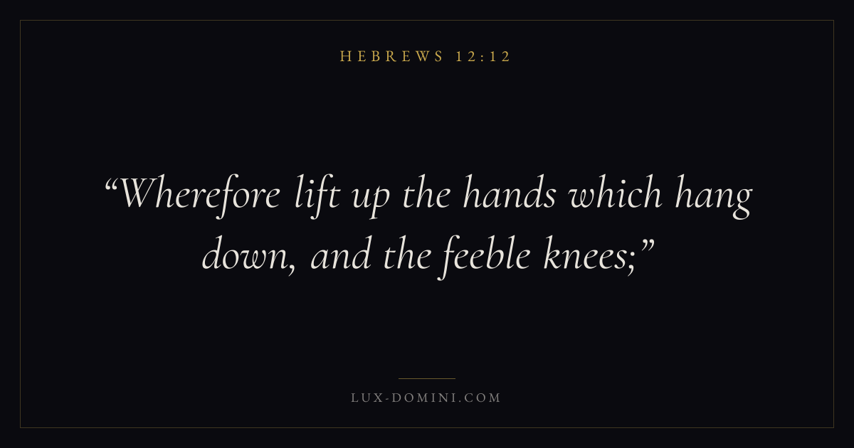 Books / Hebrews / Chapter 12 / Verse 12 ← Hebrews 12:11 Hebrews 12:12 Hebrews 12:13 → Wherefore lift up the hands which hang down, and the feeble knees; Download verse card Share on Twitter Share on Facebook Pin it ✦ Key themes FaithSuffering and trialsChristologyPriesthood Read with Hebrews 12:9Hebrews 12:10Hebrews 11:1Romans 10:17 Related topics Bible verses about faithBible verses about suffering and trials ✦ Hebrews Chapter 12 verses V. 1 V. 2 V. 3 V. 4 V. 5 V. 6 V. 7 V. 8 V. 9 V. 10 V. 11 V. 12 V. 13 V. 14 V. 15 V. 16 V. 17 V. 18 V. 19 V. 20 V. 21 V. 22 V. 23 V. 24 V. 25 V. 26 V. 27 V. 28 V. 29