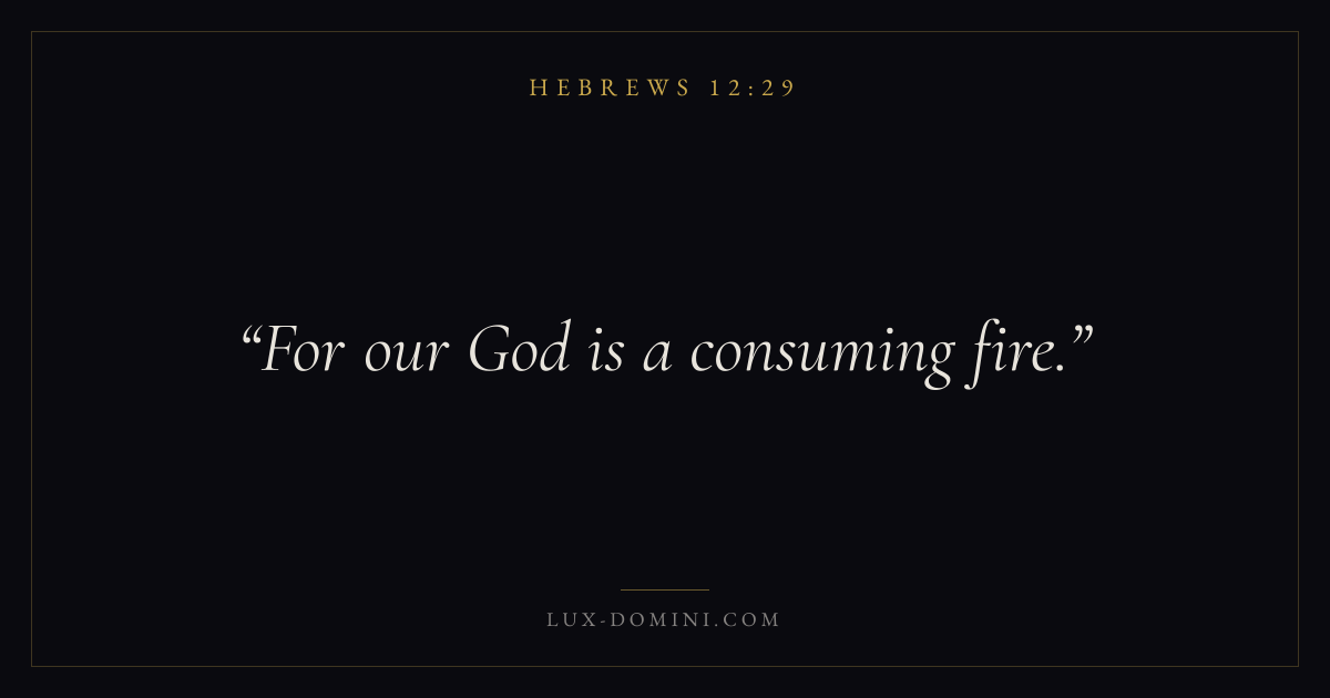 Books / Hebrews / Chapter 12 / Verse 29 ← Hebrews 12:28 Hebrews 12:29 Hebrews 13:1 → For our God is a consuming fire. Download verse card Share on Twitter Share on Facebook Pin it ✦ Key themes FaithChristologyPriesthoodSacrifice Read with Hebrews 12:25Hebrews 12:26Hebrews 11:1Romans 10:17 Related topics Bible verses about faith ✦ Hebrews Chapter 12 verses V. 1 V. 2 V. 3 V. 4 V. 5 V. 6 V. 7 V. 8 V. 9 V. 10 V. 11 V. 12 V. 13 V. 14 V. 15 V. 16 V. 17 V. 18 V. 19 V. 20 V. 21 V. 22 V. 23 V. 24 V. 25 V. 26 V. 27 V. 28 V. 29