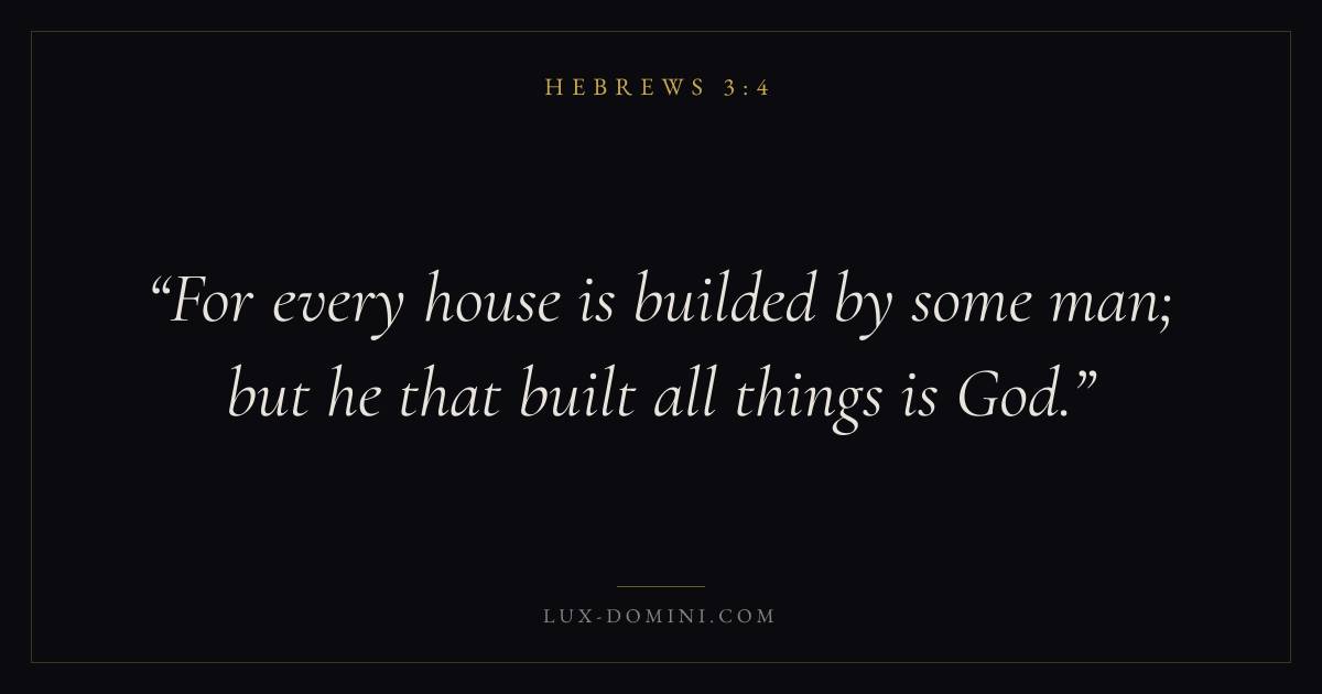 Books / Hebrews / Chapter 3 / Verse 4 ← Hebrews 3:3 Hebrews 3:4 Hebrews 3:5 → For every house is builded by some man; but he that built all things is God. Download verse card Share on Twitter Share on Facebook Pin it ✦ Key themes FaithHopeChristologyPriesthood Read with Hebrews 3:1Hebrews 3:2Hebrews 11:1Romans 10:17 Related topics Bible verses about faithBible verses about hope ✦ Hebrews Chapter 3 verses V. 1 V. 2 V. 3 V. 4 V. 5 V. 6 V. 7 V. 8 V. 9 V. 10 V. 11 V. 12 V. 13 V. 14 V. 15 V. 16 V. 17 V. 18 V. 19