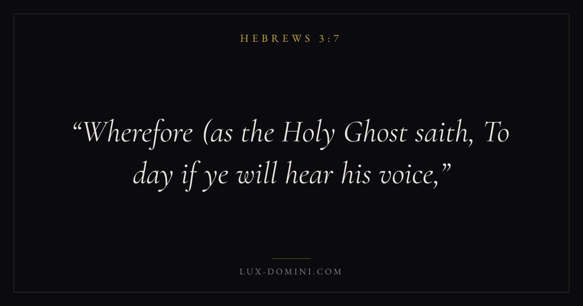 Books / Hebrews / Chapter 3 / Verse 7 ← Hebrews 3:6 Hebrews 3:7 Hebrews 3:8 → Wherefore (as the Holy Ghost saith, To day if ye will hear his voice, Download verse card Share on Twitter Share on Facebook Pin it ✦ Key themes FaithChristologyPriesthoodSacrifice Read with Hebrews 3:6Hebrews 3:8Hebrews 11:1Romans 10:17 Related topics Bible verses about faith ✦ Hebrews Chapter 3 verses V. 1 V. 2 V. 3 V. 4 V. 5 V. 6 V. 7 V. 8 V. 9 V. 10 V. 11 V. 12 V. 13 V. 14 V. 15 V. 16 V. 17 V. 18 V. 19