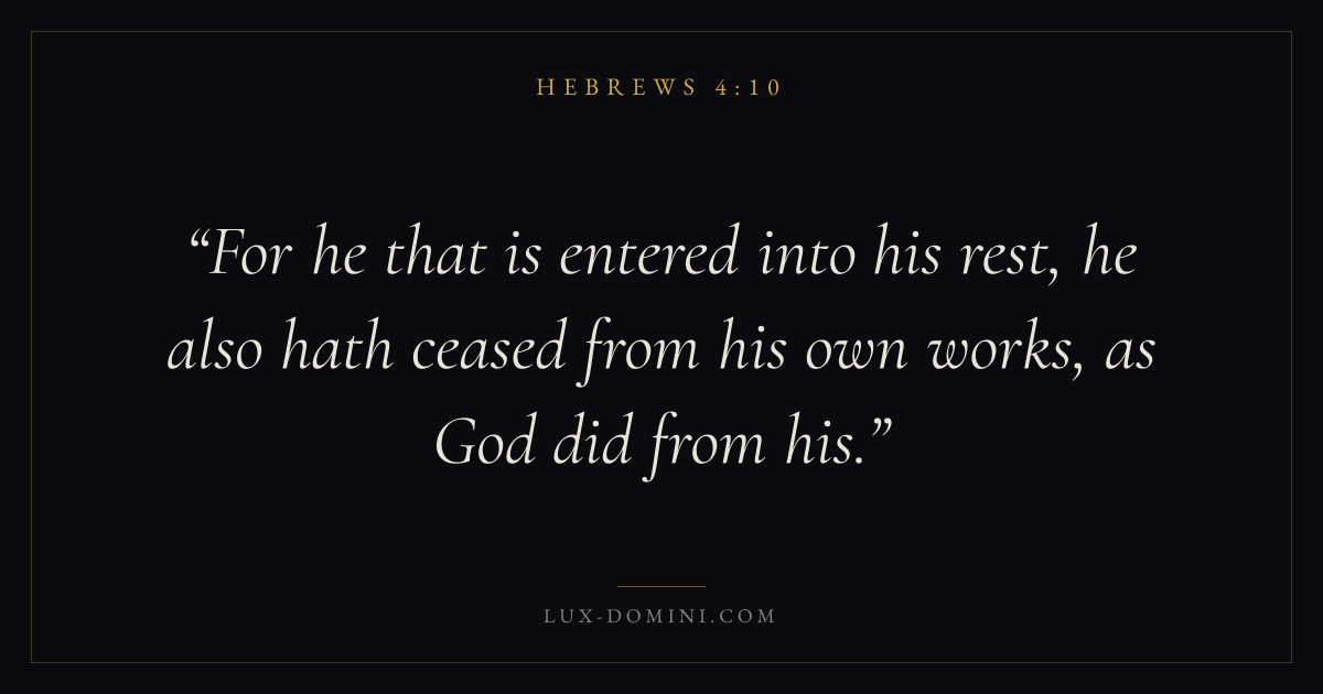 Books / Hebrews / Chapter 4 / Verse 10 ← Hebrews 4:9 Hebrews 4:10 Hebrews 4:11 → For he that is entered into his rest, he also hath ceased from his own works, as God did from his. Download verse card Share on Twitter Share on Facebook Pin it ✦ Key themes FaithPeaceTruthChristology Read with Hebrews 4:9Hebrews 11:1Romans 10:17John 14:27 Related topics Bible verses about faithBible verses about peaceBible verses about truth ✦ Hebrews Chapter 4 verses V. 1 V. 2 V. 3 V. 4 V. 5 V. 6 V. 7 V. 8 V. 9 V. 10 V. 11 V. 12 V. 13 V. 14 V. 15 V. 16