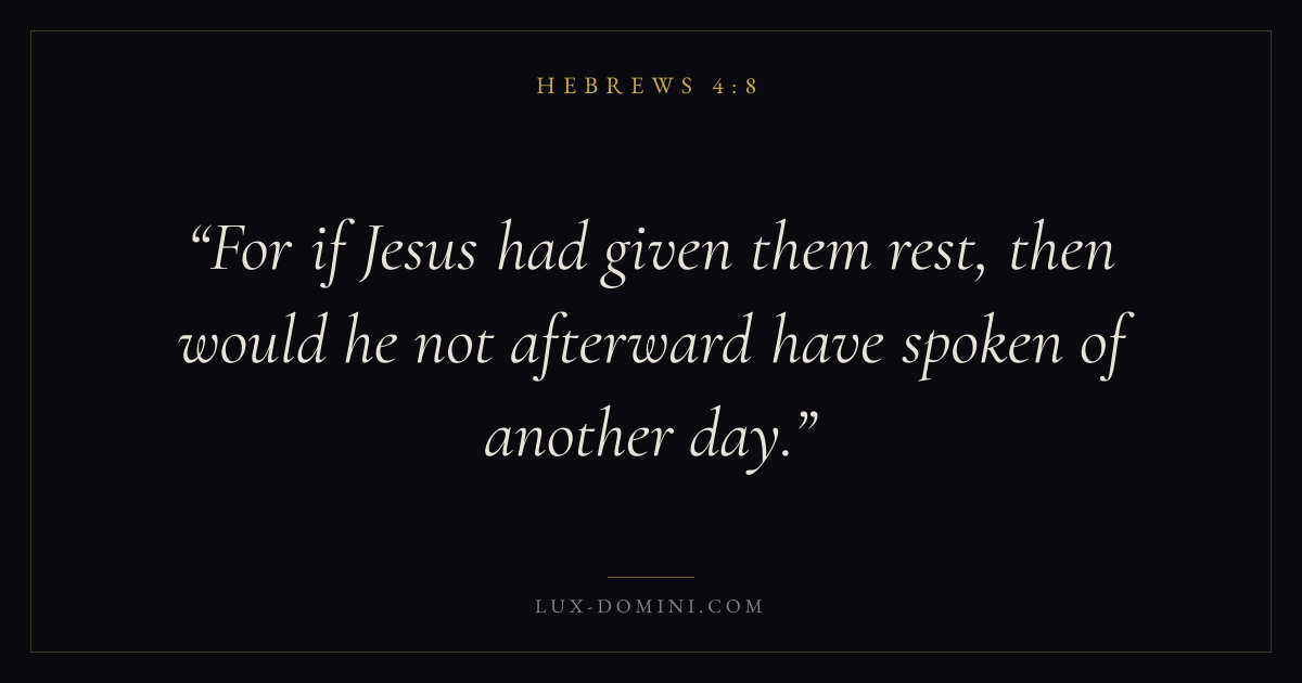 Books / Hebrews / Chapter 4 / Verse 8 ← Hebrews 4:7 Hebrews 4:8 Hebrews 4:9 → For if Jesus had given them rest, then would he not afterward have spoken of another day. Download verse card Share on Twitter Share on Facebook Pin it ✦ Key themes FaithPeaceTruthChristology Read with Hebrews 4:6Hebrews 4:7Hebrews 11:1Romans 10:17 Related topics Bible verses about faithBible verses about peaceBible verses about truth ✦ Hebrews Chapter 4 verses V. 1 V. 2 V. 3 V. 4 V. 5 V. 6 V. 7 V. 8 V. 9 V. 10 V. 11 V. 12 V. 13 V. 14 V. 15 V. 16