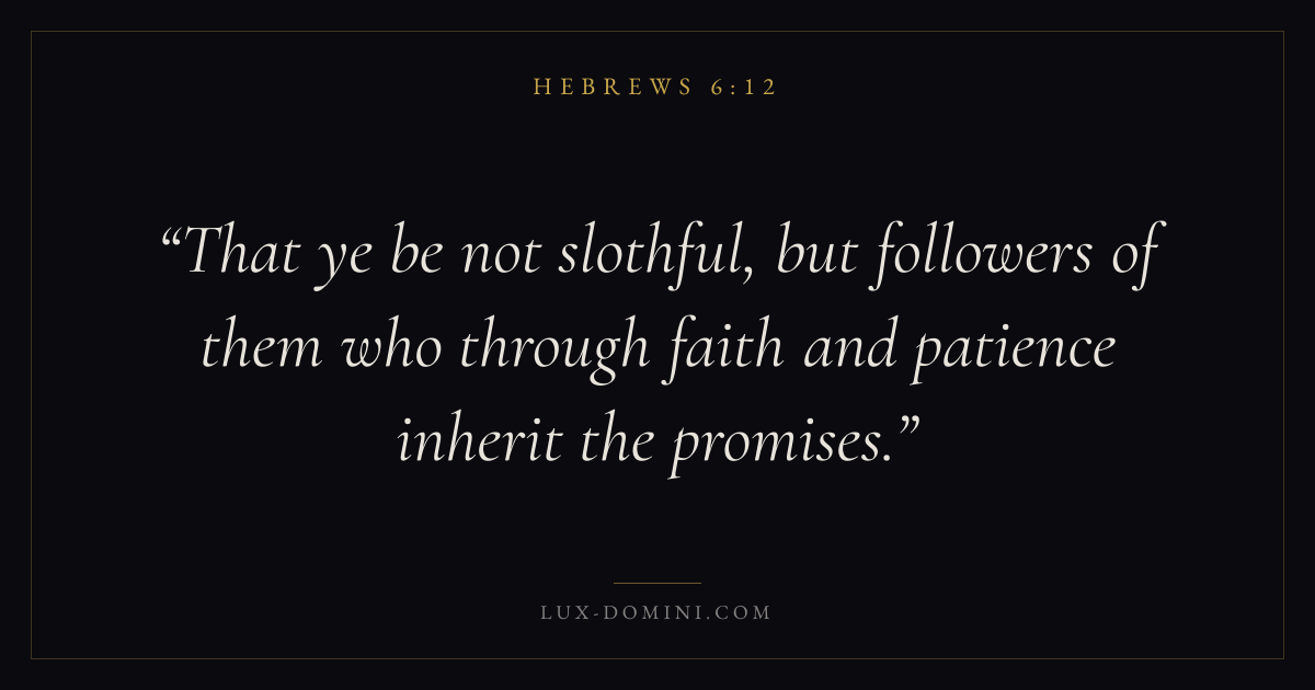 Books / Hebrews / Chapter 6 / Verse 12 ← Hebrews 6:11 Hebrews 6:12 Hebrews 6:13 → That ye be not slothful, but followers of them who through faith and patience inherit the promises. Download verse card Share on Twitter Share on Facebook Pin it ✦ Key themes LoveFaithHopeChristology Read with Hebrews 6:11Hebrews 6:13John 3:161 Corinthians 13:4 Related topics Bible verses about loveBible verses about faithBible verses about hope ✦ Hebrews Chapter 6 verses V. 1 V. 2 V. 3 V. 4 V. 5 V. 6 V. 7 V. 8 V. 9 V. 10 V. 11 V. 12 V. 13 V. 14 V. 15 V. 16 V. 17 V. 18 V. 19 V. 20