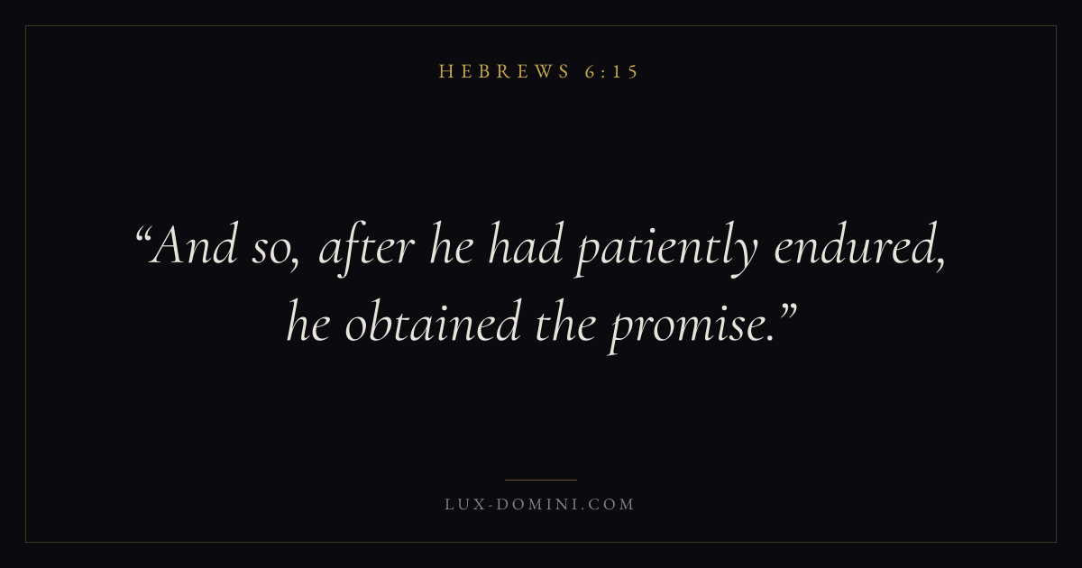 Books / Hebrews / Chapter 6 / Verse 15 ← Hebrews 6:14 Hebrews 6:15 Hebrews 6:16 → And so, after he had patiently endured, he obtained the promise. Download verse card Share on Twitter Share on Facebook Pin it ✦ Key themes LoveFaithHopeChristology Read with Hebrews 6:11Hebrews 6:12John 3:161 Corinthians 13:4 Related topics Bible verses about loveBible verses about faithBible verses about hope ✦ Hebrews Chapter 6 verses V. 1 V. 2 V. 3 V. 4 V. 5 V. 6 V. 7 V. 8 V. 9 V. 10 V. 11 V. 12 V. 13 V. 14 V. 15 V. 16 V. 17 V. 18 V. 19 V. 20