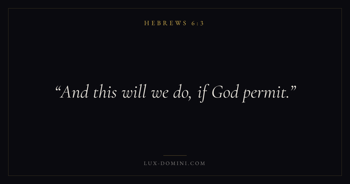 Books / Hebrews / Chapter 6 / Verse 3 ← Hebrews 6:2 Hebrews 6:3 Hebrews 6:4 → And this will we do, if God permit. Download verse card Share on Twitter Share on Facebook Pin it ✦ Key themes FaithTruthChristologyPriesthood Read with Hebrews 6:1Hebrews 6:2Hebrews 11:1Romans 10:17 Related topics Bible verses about faithBible verses about truth ✦ Hebrews Chapter 6 verses V. 1 V. 2 V. 3 V. 4 V. 5 V. 6 V. 7 V. 8 V. 9 V. 10 V. 11 V. 12 V. 13 V. 14 V. 15 V. 16 V. 17 V. 18 V. 19 V. 20