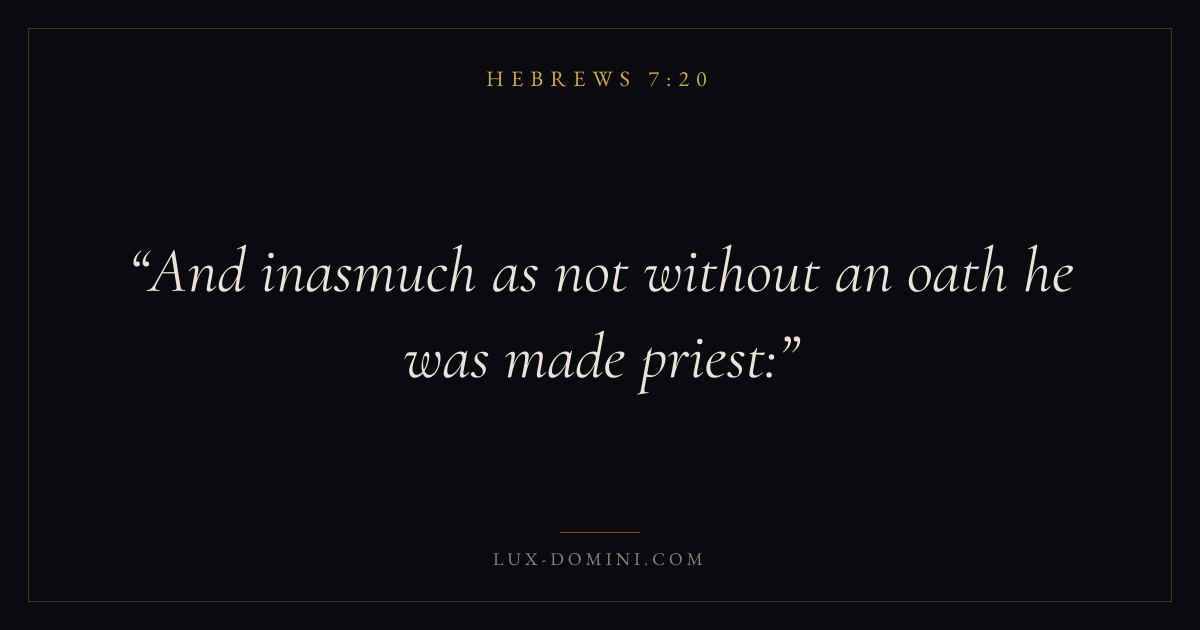 Books / Hebrews / Chapter 7 / Verse 20 ← Hebrews 7:19 Hebrews 7:20 Hebrews 7:21 → And inasmuch as not without an oath he was made priest: Download verse card Share on Twitter Share on Facebook Pin it ✦ Key themes FaithTruthChristologyPriesthood Read with Hebrews 7:16Hebrews 7:17Hebrews 11:1Romans 10:17 Related topics Bible verses about faithBible verses about truth ✦ Hebrews Chapter 7 verses V. 1 V. 2 V. 3 V. 4 V. 5 V. 6 V. 7 V. 8 V. 9 V. 10 V. 11 V. 12 V. 13 V. 14 V. 15 V. 16 V. 17 V. 18 V. 19 V. 20 V. 21 V. 22 V. 23 V. 24 V. 25 V. 26 V. 27 V. 28