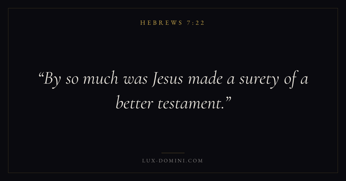 Books / Hebrews / Chapter 7 / Verse 22 ← Hebrews 7:21 Hebrews 7:22 Hebrews 7:23 → By so much was Jesus made a surety of a better testament. Download verse card Share on Twitter Share on Facebook Pin it ✦ Key themes FaithTruthChristologyPriesthood Read with Hebrews 7:21Hebrews 7:23Hebrews 11:1Romans 10:17 Related topics Bible verses about faithBible verses about truth ✦ Hebrews Chapter 7 verses V. 1 V. 2 V. 3 V. 4 V. 5 V. 6 V. 7 V. 8 V. 9 V. 10 V. 11 V. 12 V. 13 V. 14 V. 15 V. 16 V. 17 V. 18 V. 19 V. 20 V. 21 V. 22 V. 23 V. 24 V. 25 V. 26 V. 27 V. 28