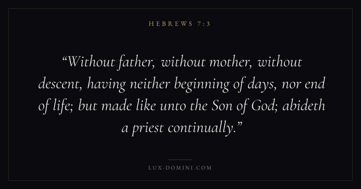 Without father, without mother, without descent, having neither beginning of days, nor end of life; but made like unto the Son of God; abideth a priest continually.