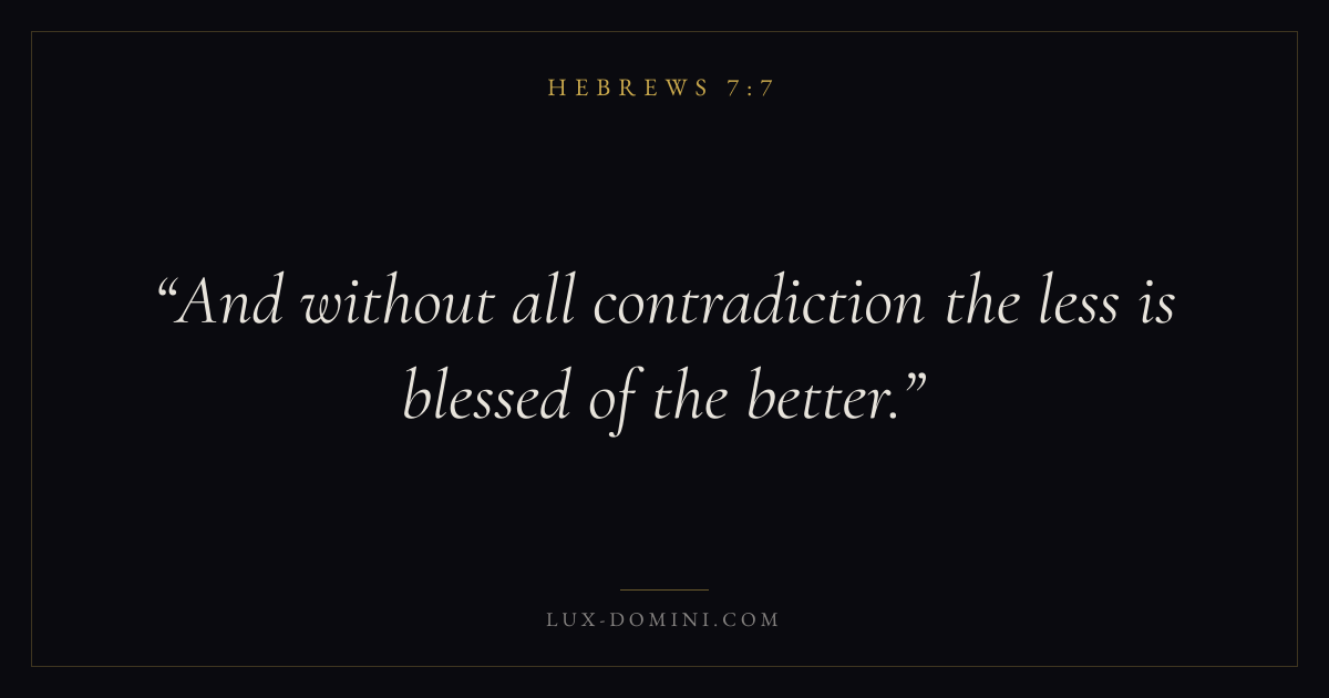 Books / Hebrews / Chapter 7 / Verse 7 ← Hebrews 7:6 Hebrews 7:7 Hebrews 7:8 → And without all contradiction the less is blessed of the better. Download verse card Share on Twitter Share on Facebook Pin it ✦ Key themes FaithChristologyPriesthoodSacrifice Read with Hebrews 7:6Hebrews 7:8Hebrews 11:1Romans 10:17 Related topics Bible verses about faith ✦ Hebrews Chapter 7 verses V. 1 V. 2 V. 3 V. 4 V. 5 V. 6 V. 7 V. 8 V. 9 V. 10 V. 11 V. 12 V. 13 V. 14 V. 15 V. 16 V. 17 V. 18 V. 19 V. 20 V. 21 V. 22 V. 23 V. 24 V. 25 V. 26 V. 27 V. 28