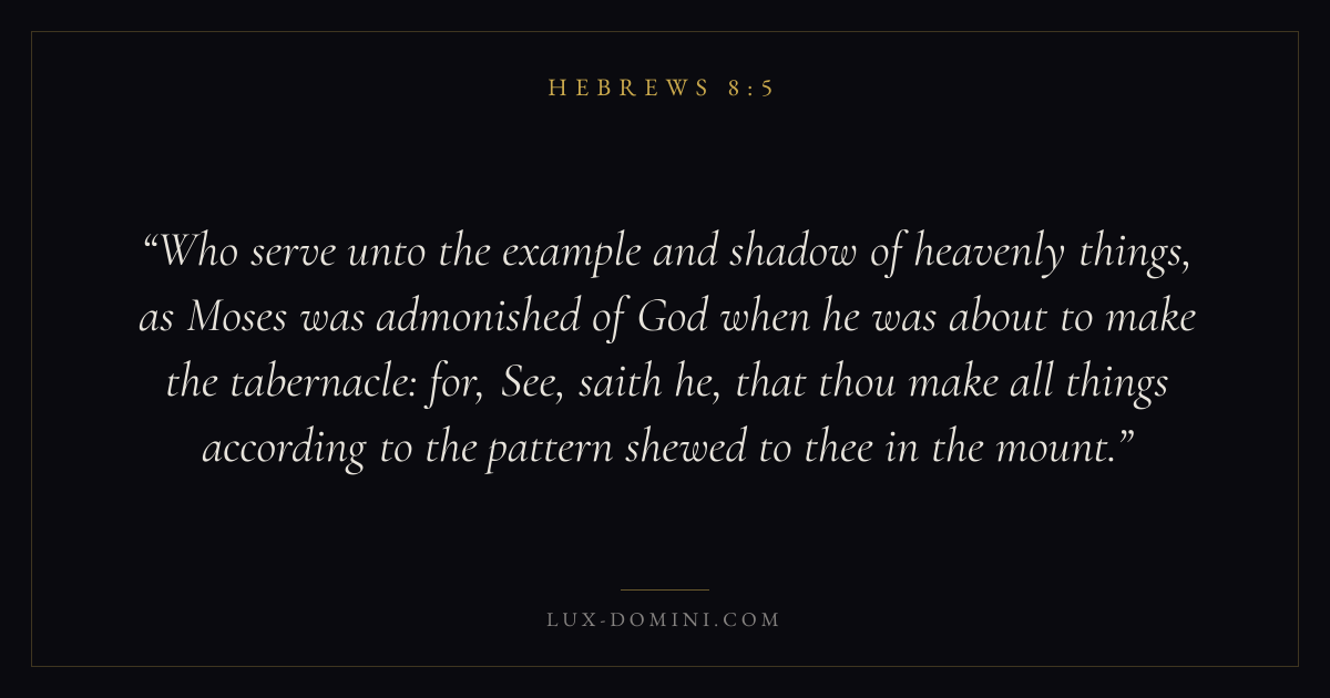 Who serve unto the example and shadow of heavenly things, as Moses was admonished of God when he was about to make the tabernacle: for, See, saith he, that thou make all things according to the pattern shewed to thee in the mount.