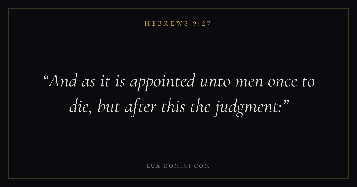 Books / Hebrews / Chapter 9 / Verse 27 ← Hebrews 9:26 Hebrews 9:27 Hebrews 9:28 → And as it is appointed unto men once to die, but after this the judgment: Download verse card Share on Twitter Share on Facebook Pin it ✦ Key themes FaithJustice and mercyForgivenessChristology Read with Hebrews 9:23Hebrews 9:24Hebrews 11:1Romans 10:17 Related topics Bible verses about faithBible verses about justice and mercyBible verses about forgiveness ✦ Hebrews Chapter 9 verses V. 1 V. 2 V. 3 V. 4 V. 5 V. 6 V. 7 V. 8 V. 9 V. 10 V. 11 V. 12 V. 13 V. 14 V. 15 V. 16 V. 17 V. 18 V. 19 V. 20 V. 21 V. 22 V. 23 V. 24 V. 25 V. 26 V. 27 V. 28