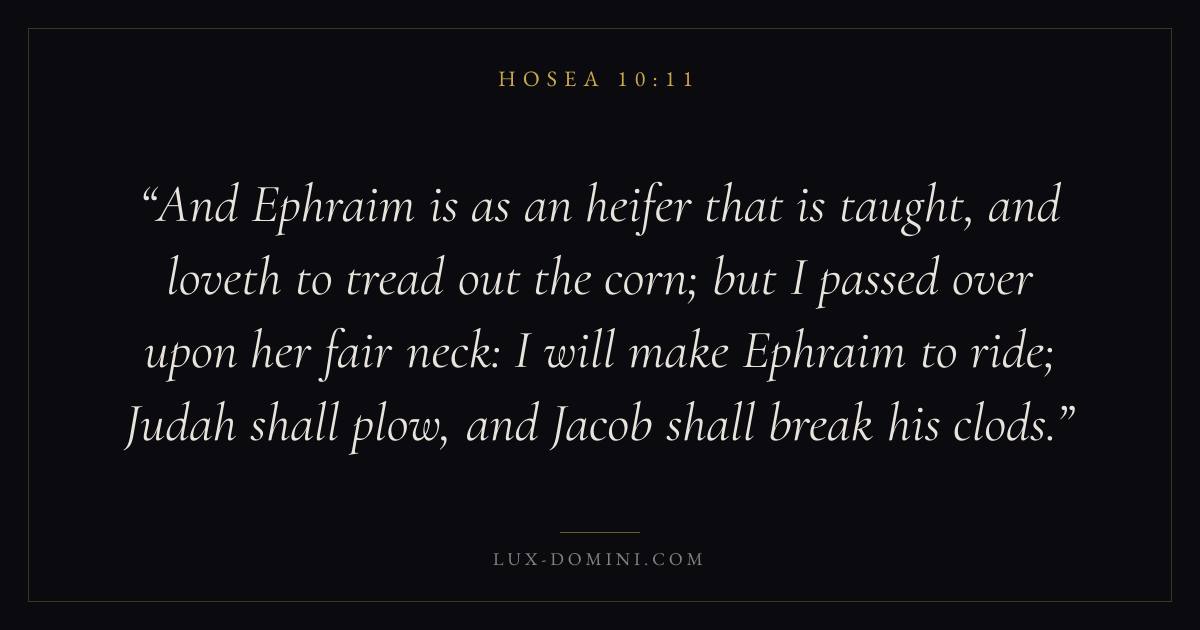 And Ephraim is as an heifer that is taught, and loveth to tread out the corn; but I passed over upon her fair neck: I will make Ephraim to ride; Judah shall plow, and Jacob shall break his clods.