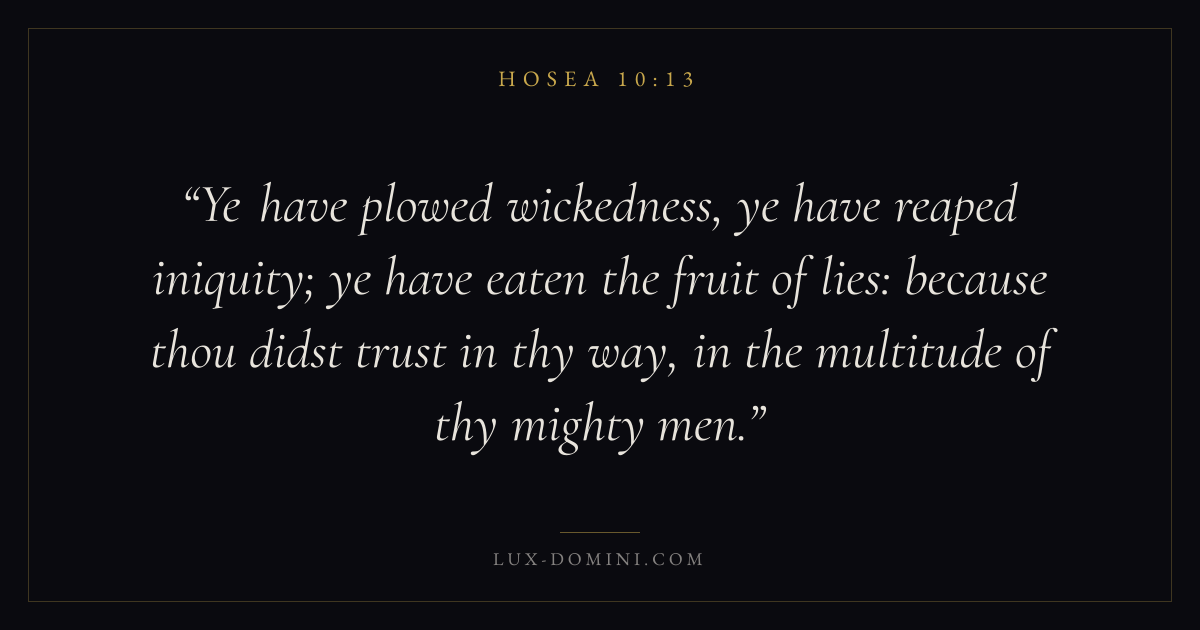 Ye have plowed wickedness, ye have reaped iniquity; ye have eaten the fruit of lies: because thou didst trust in thy way, in the multitude of thy mighty men.