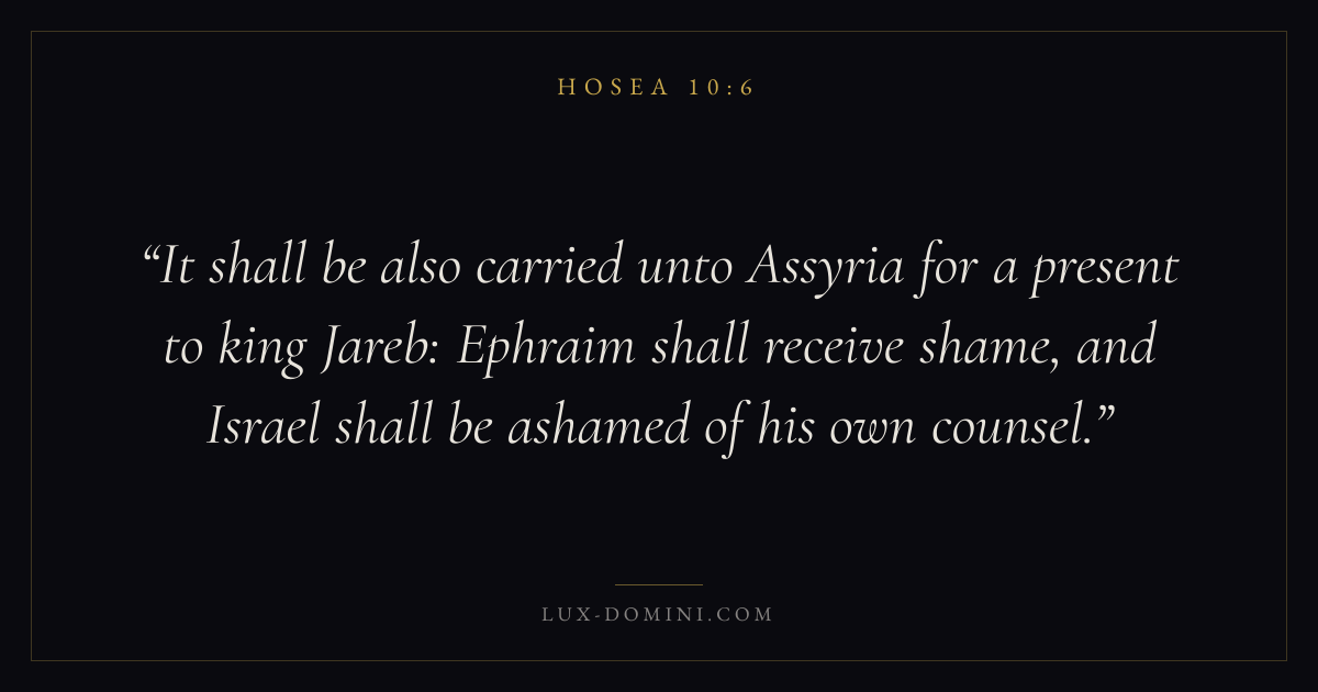 It shall be also carried unto Assyria for a present to king Jareb: Ephraim shall receive shame, and Israel shall be ashamed of his own counsel.