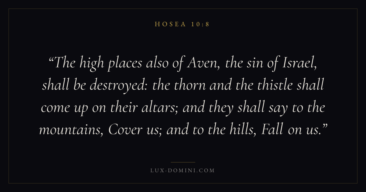 The high places also of Aven, the sin of Israel, shall be destroyed: the thorn and the thistle shall come up on their altars; and they shall say to the mountains, Cover us; and to the hills, Fall on us.