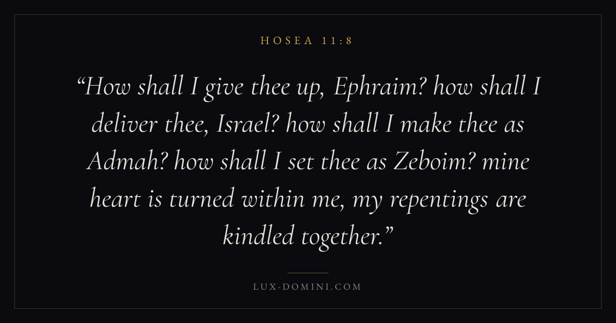 How shall I give thee up, Ephraim? how shall I deliver thee, Israel? how shall I make thee as Admah? how shall I set thee as Zeboim? mine heart is turned within me, my repentings are kindled together.