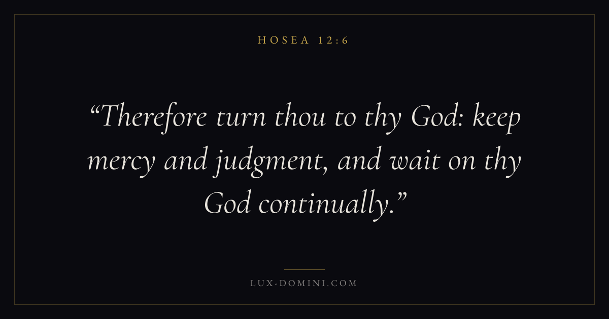 Books / Hosea / Chapter 12 / Verse 6 ← Hosea 12:5 Hosea 12:6 Hosea 12:7 → Therefore turn thou to thy God: keep mercy and judgment, and wait on thy God continually. Download verse card Share on Twitter Share on Facebook Pin it ✦ Key themes LoveHopeWisdomJustice and mercyCovenant love Read with Hosea 12:3Hosea 12:4John 3:161 Corinthians 13:4 Related topics Bible verses about loveBible verses about hopeBible verses about wisdomBible verses about justice and mercy ✦ Hosea Chapter 12 verses V. 1 V. 2 V. 3 V. 4 V. 5 V. 6 V. 7 V. 8 V. 9 V. 10 V. 11 V. 12 V. 13 V. 14