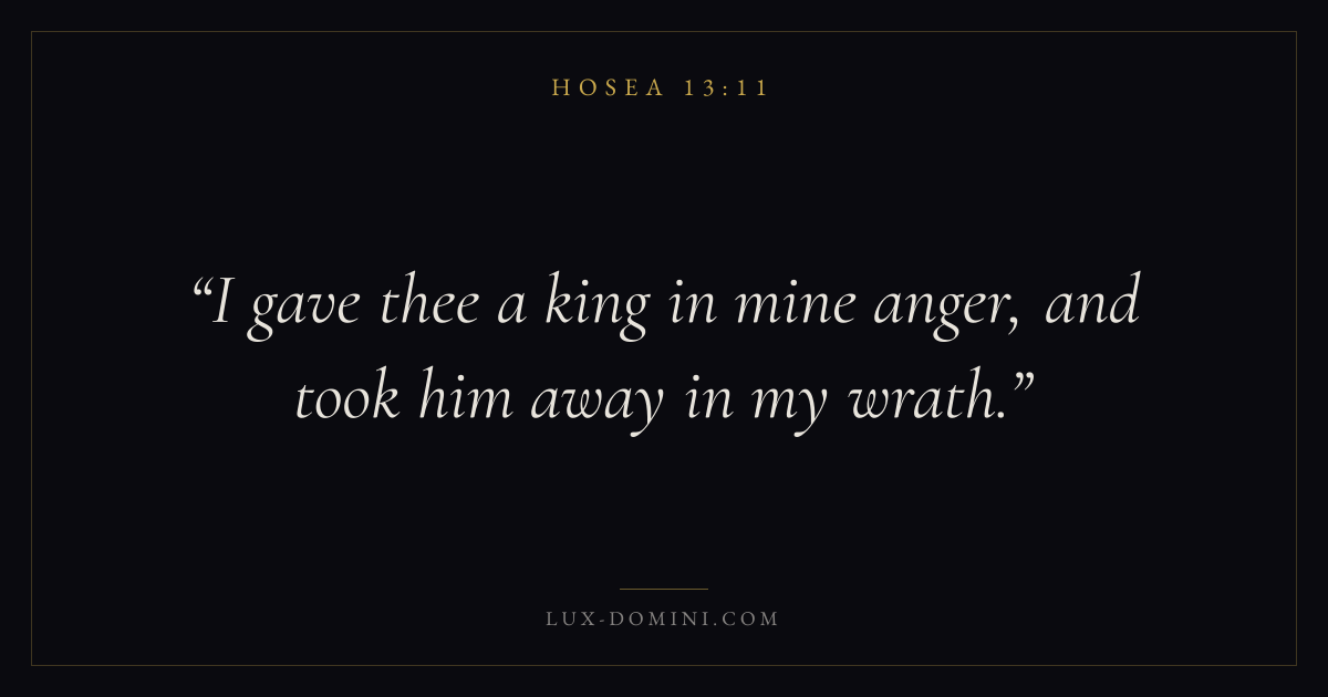 Books / Hosea / Chapter 13 / Verse 11 ← Hosea 13:10 Hosea 13:11 Hosea 13:12 → I gave thee a king in mine anger, and took him away in my wrath. Download verse card Share on Twitter Share on Facebook Pin it ✦ Key themes LoveWisdomJustice and mercySalvationCovenant love Read with Hosea 13:12John 3:161 Corinthians 13:4Proverbs 1:7 Related topics Bible verses about loveBible verses about wisdomBible verses about justice and mercyBible verses about salvation ✦ Hosea Chapter 13 verses V. 1 V. 2 V. 3 V. 4 V. 5 V. 6 V. 7 V. 8 V. 9 V. 10 V. 11 V. 12 V. 13 V. 14 V. 15 V. 16
