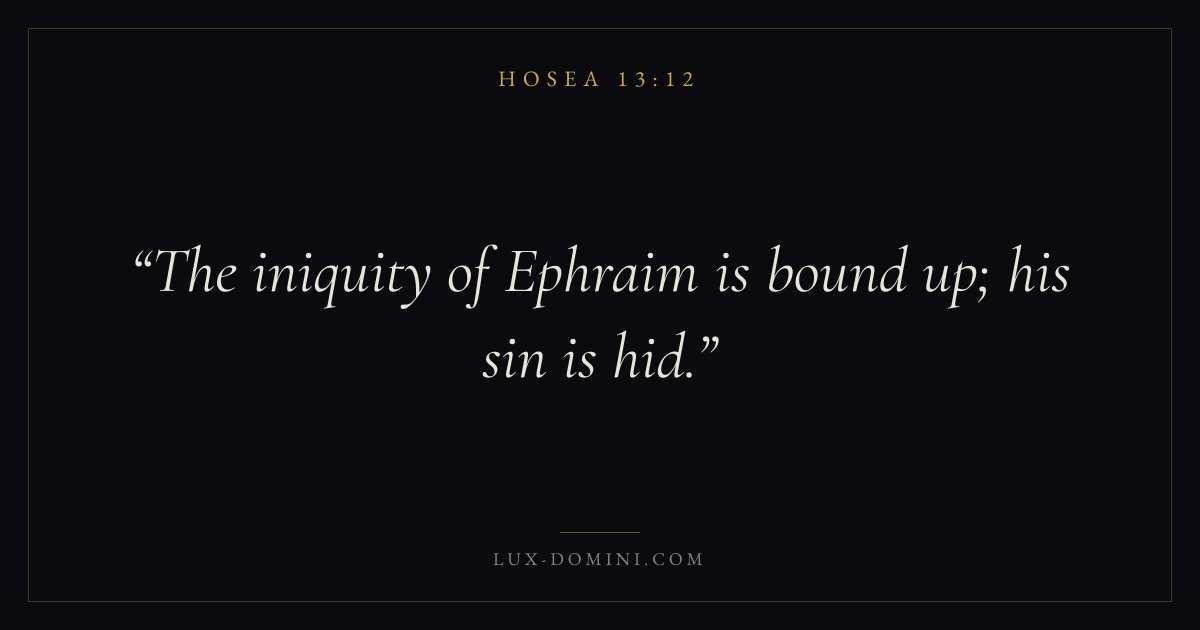 Books / Hosea / Chapter 13 / Verse 12 ← Hosea 13:11 Hosea 13:12 Hosea 13:13 → The iniquity of Ephraim is bound up; his sin is hid. Download verse card Share on Twitter Share on Facebook Pin it ✦ Key themes LoveWisdomJustice and mercySalvationCovenant love Read with Hosea 13:11John 3:161 Corinthians 13:4Proverbs 1:7 Related topics Bible verses about loveBible verses about wisdomBible verses about justice and mercyBible verses about salvation ✦ Hosea Chapter 13 verses V. 1 V. 2 V. 3 V. 4 V. 5 V. 6 V. 7 V. 8 V. 9 V. 10 V. 11 V. 12 V. 13 V. 14 V. 15 V. 16