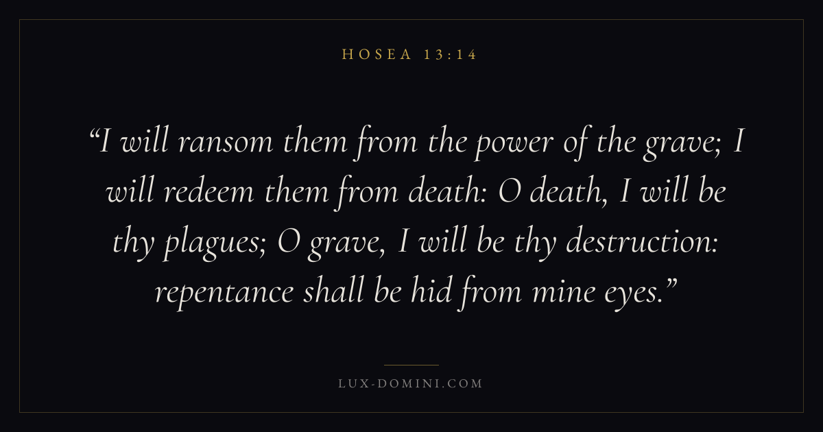 I will ransom them from the power of the grave; I will redeem them from death: O death, I will be thy plagues; O grave, I will be thy destruction: repentance shall be hid from mine eyes.