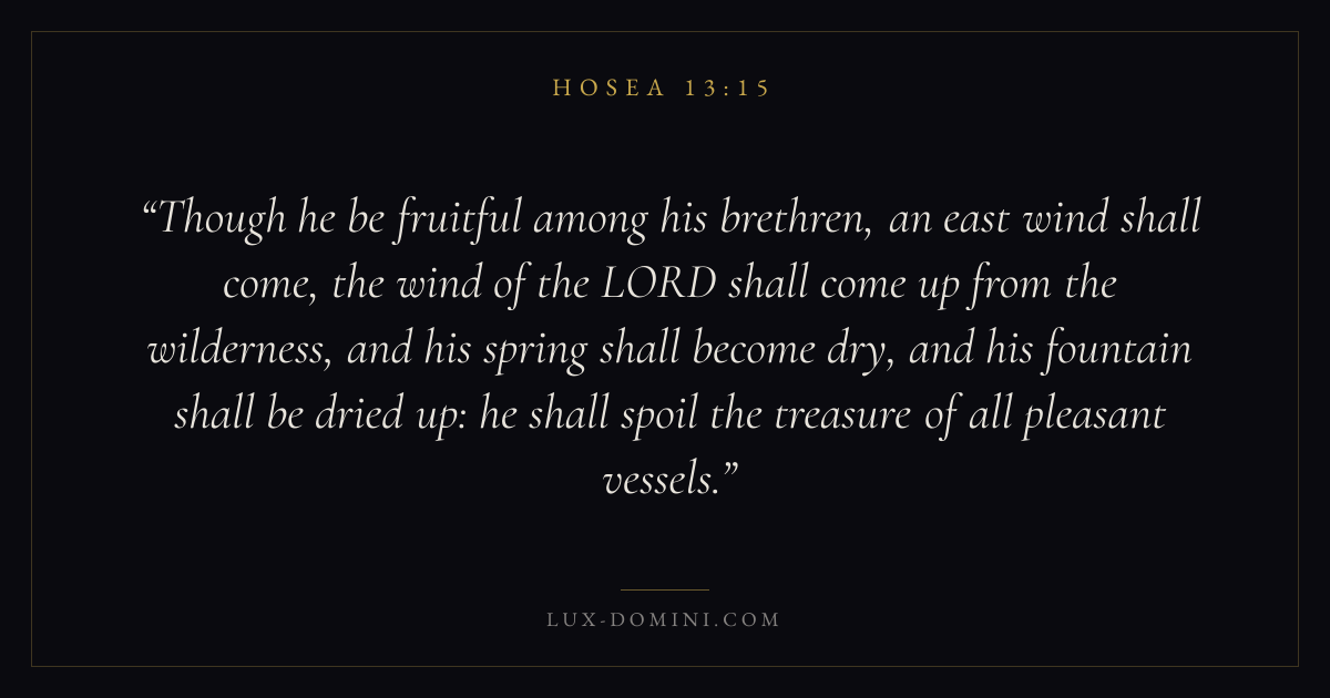 Though he be fruitful among his brethren, an east wind shall come, the wind of the LORD shall come up from the wilderness, and his spring shall become dry, and his fountain shall be dried up: he shall spoil the treasure of all pleasant vessels.
