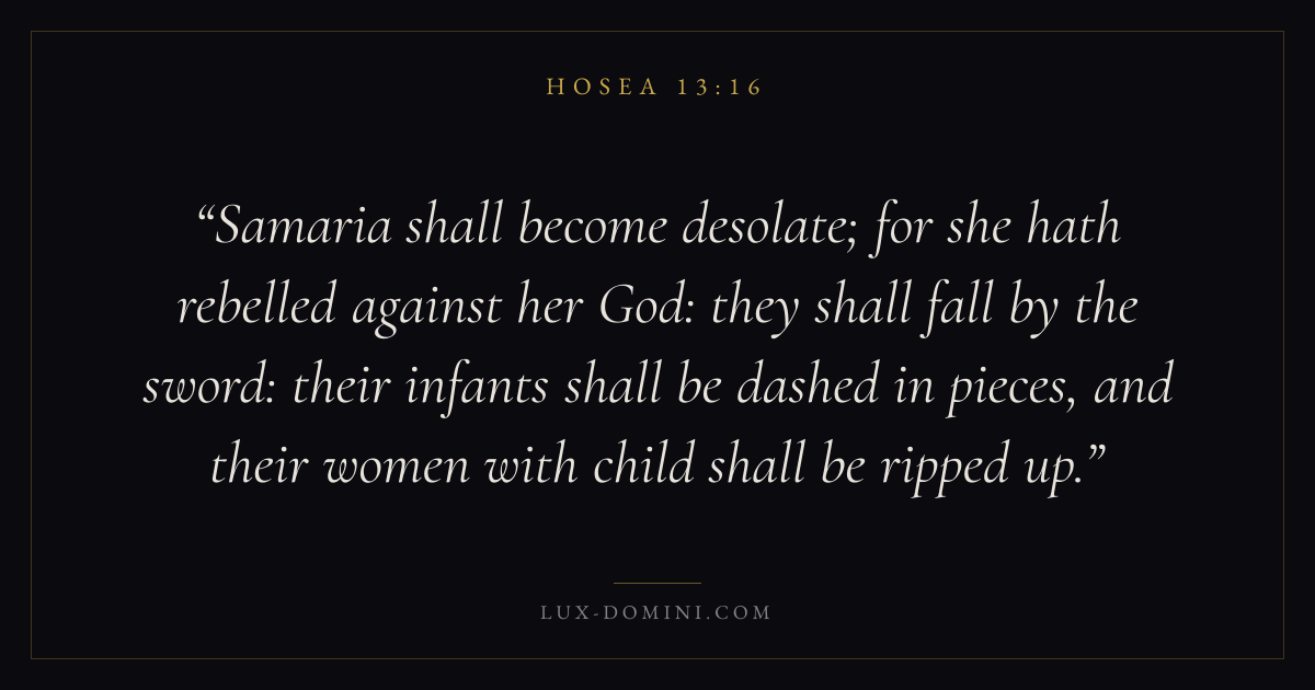 Samaria shall become desolate; for she hath rebelled against her God: they shall fall by the sword: their infants shall be dashed in pieces, and their women with child shall be ripped up.