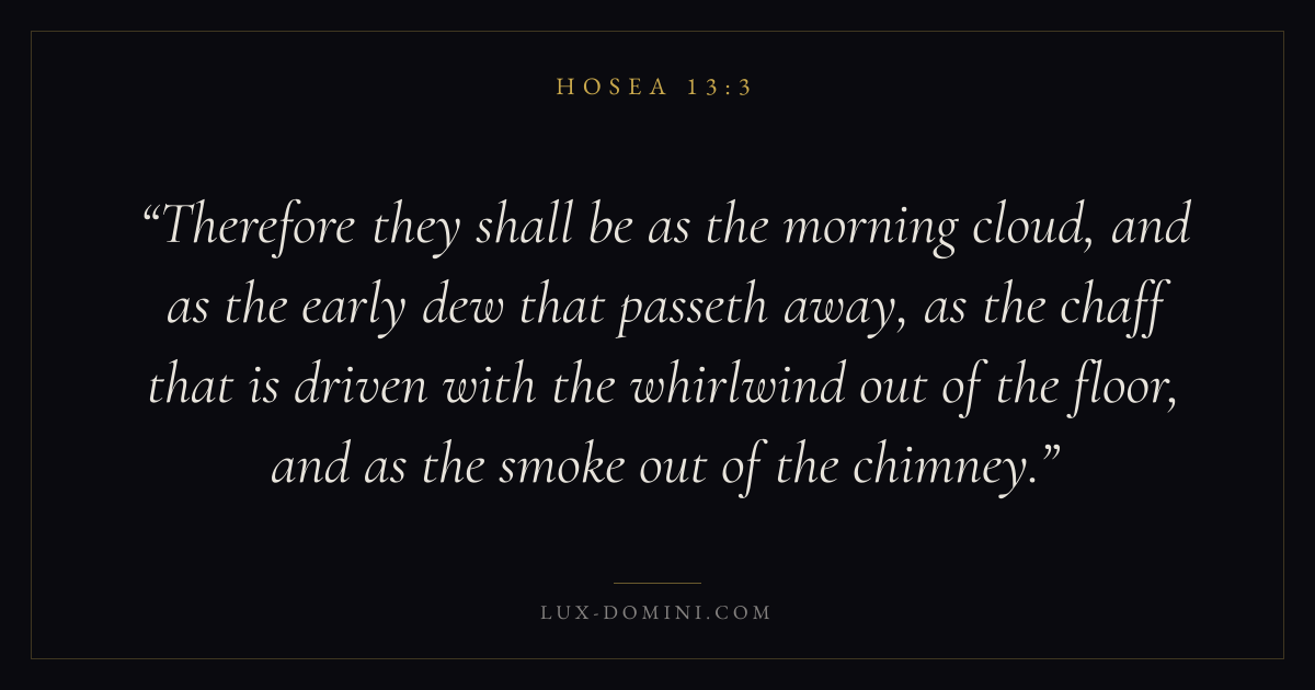 Therefore they shall be as the morning cloud, and as the early dew that passeth away, as the chaff that is driven with the whirlwind out of the floor, and as the smoke out of the chimney.