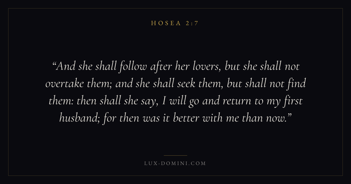 And she shall follow after her lovers, but she shall not overtake them; and she shall seek them, but shall not find them: then shall she say, I will go and return to my first husband; for then was it better with me than now.