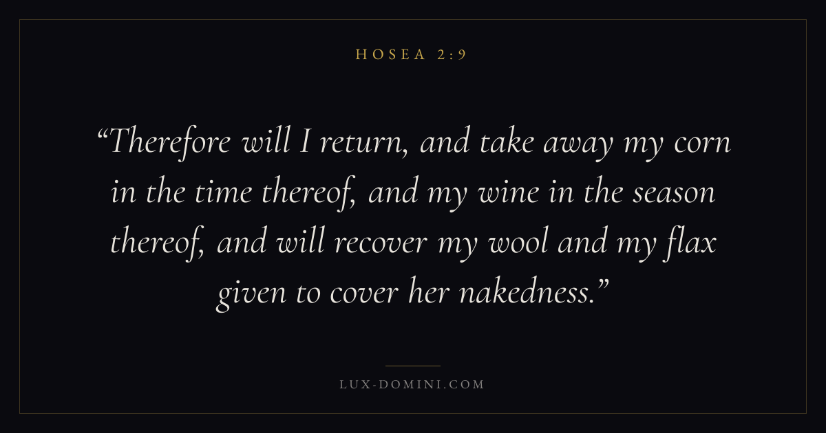 Therefore will I return, and take away my corn in the time thereof, and my wine in the season thereof, and will recover my wool and my flax given to cover her nakedness.