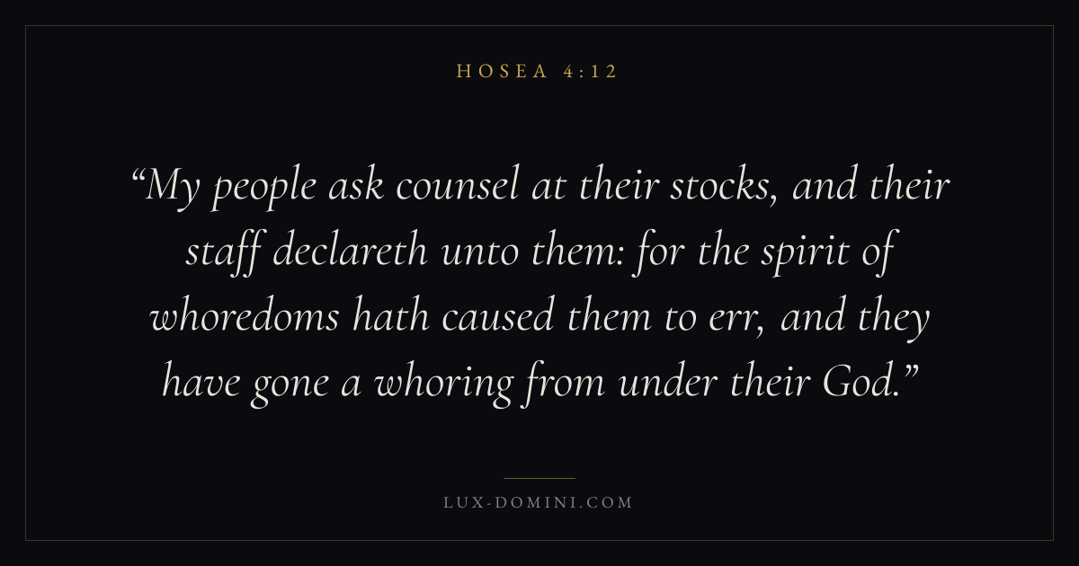 My people ask counsel at their stocks, and their staff declareth unto them: for the spirit of whoredoms hath caused them to err, and they have gone a whoring from under their God.