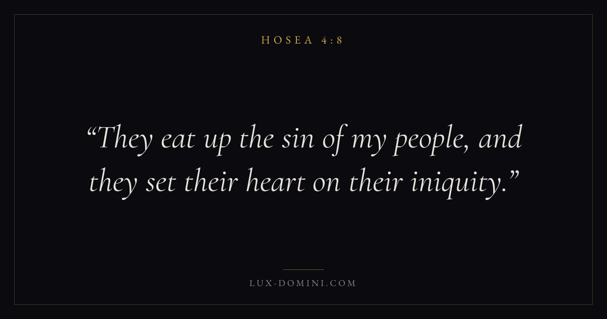 Books / Hosea / Chapter 4 / Verse 8 ← Hosea 4:7 Hosea 4:8 Hosea 4:9 → They eat up the sin of my people, and they set their heart on their iniquity. Download verse card Share on Twitter Share on Facebook Pin it ✦ Key themes LoveWisdomJustice and mercyCovenant love Read with Hosea 4:9Hosea 4:10John 3:161 Corinthians 13:4 Related topics Bible verses about loveBible verses about wisdomBible verses about justice and mercy ✦ Hosea Chapter 4 verses V. 1 V. 2 V. 3 V. 4 V. 5 V. 6 V. 7 V. 8 V. 9 V. 10 V. 11 V. 12 V. 13 V. 14 V. 15 V. 16 V. 17 V. 18 V. 19