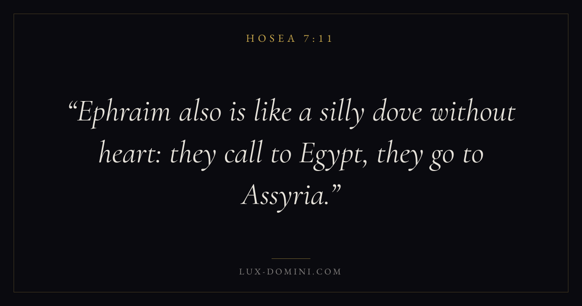Books / Hosea / Chapter 7 / Verse 11 ← Hosea 7:10 Hosea 7:11 Hosea 7:12 → Ephraim also is like a silly dove without heart: they call to Egypt, they go to Assyria. Download verse card Share on Twitter Share on Facebook Pin it ✦ Key themes LoveWisdomJustice and mercyCovenant love Read with Hosea 7:12John 3:161 Corinthians 13:4Proverbs 1:7 Related topics Bible verses about loveBible verses about wisdomBible verses about justice and mercy Glossary Assyria Place Biblical region. Modern identification: Nineveh. Egypt Place The land of the Nile and the pyramids, the oldest kingdom of which we have any record, holds a place of great significance in Scripture. Modern identification: Ain Shams. ✦ Hosea Chapter 7 verses V. 1 V. 2 V. 3 V. 4 V. 5 V. 6 V. 7 V. 8 V. 9 V. 10 V. 11 V. 12 V. 13 V. 14 V. 15 V. 16