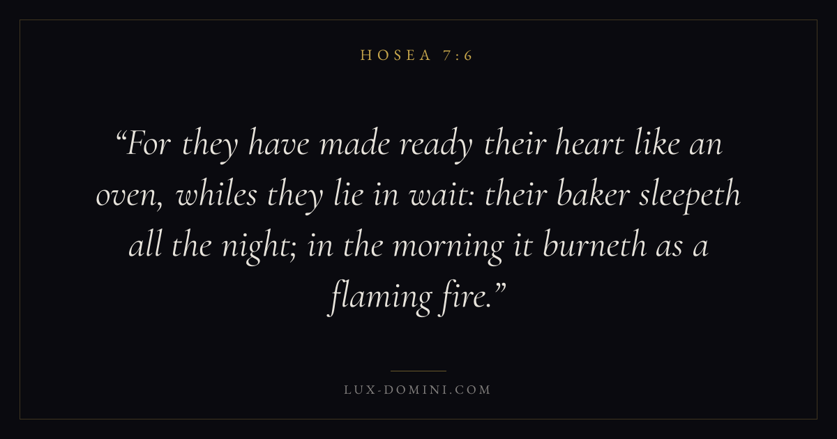 For they have made ready their heart like an oven, whiles they lie in wait: their baker sleepeth all the night; in the morning it burneth as a flaming fire.
