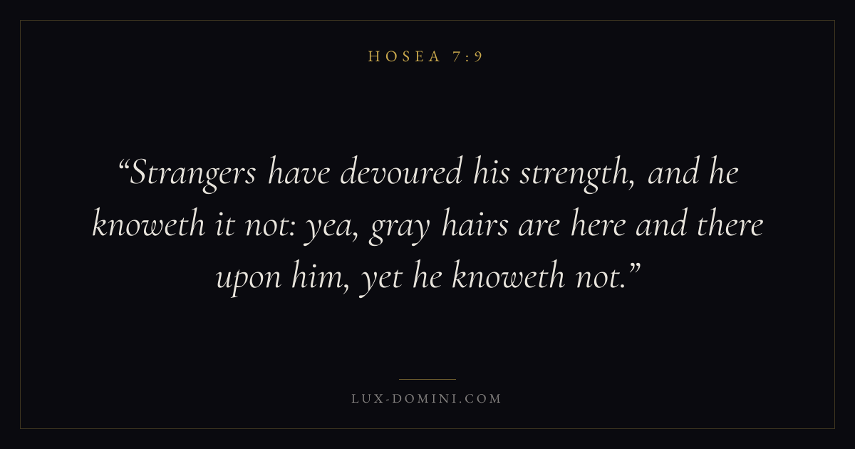 Strangers have devoured his strength, and he knoweth it not: yea, gray hairs are here and there upon him, yet he knoweth not.