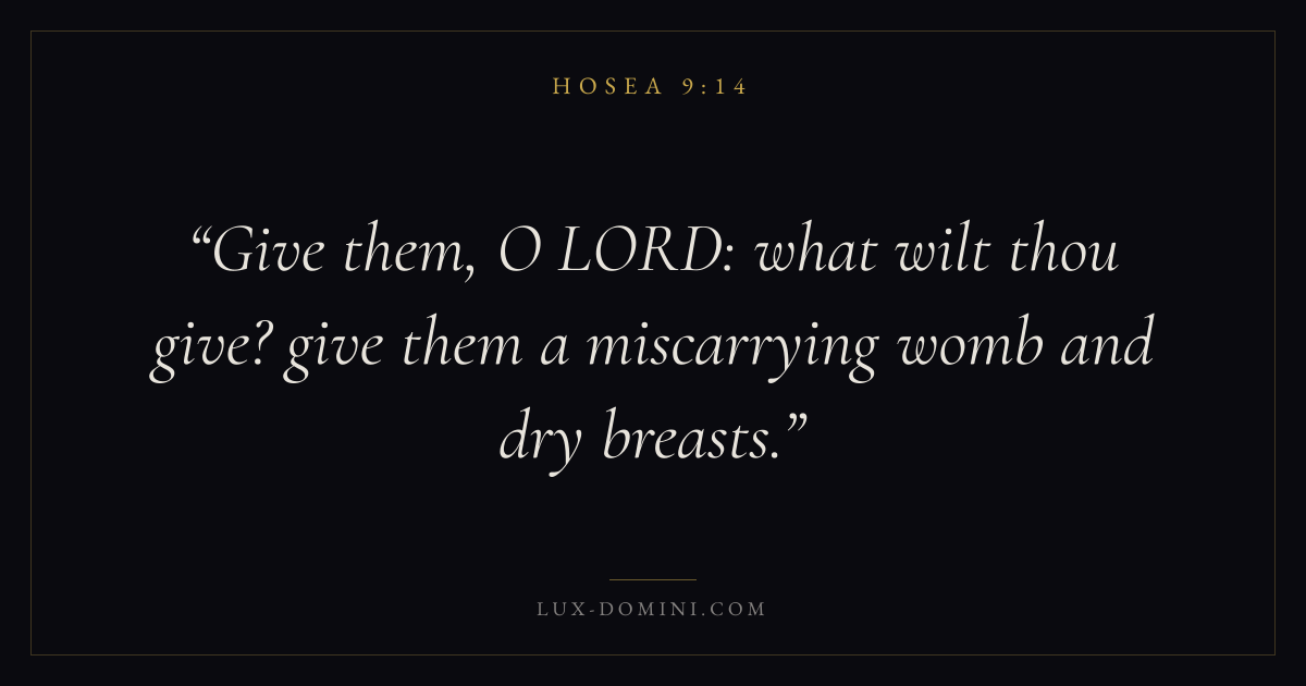 Books / Hosea / Chapter 9 / Verse 14 ← Hosea 9:13 Hosea 9:14 Hosea 9:15 → Give them, O LORD: what wilt thou give? give them a miscarrying womb and dry breasts. Download verse card Share on Twitter Share on Facebook Pin it ✦ Key themes LoveWisdomJustice and mercyCovenant love Read with Hosea 9:13John 3:161 Corinthians 13:4Proverbs 1:7 Related topics Bible verses about loveBible verses about wisdomBible verses about justice and mercy ✦ Hosea Chapter 9 verses V. 1 V. 2 V. 3 V. 4 V. 5 V. 6 V. 7 V. 8 V. 9 V. 10 V. 11 V. 12 V. 13 V. 14 V. 15 V. 16 V. 17