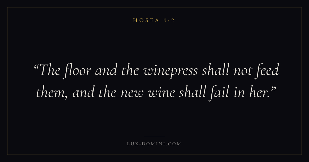 Books / Hosea / Chapter 9 / Verse 2 ← Hosea 9:1 Hosea 9:2 Hosea 9:3 → The floor and the winepress shall not feed them, and the new wine shall fail in her. Download verse card Share on Twitter Share on Facebook Pin it ✦ Key themes LoveWisdomJustice and mercyCovenant love Read with Hosea 9:1John 3:161 Corinthians 13:4Proverbs 1:7 Related topics Bible verses about loveBible verses about wisdomBible verses about justice and mercy ✦ Hosea Chapter 9 verses V. 1 V. 2 V. 3 V. 4 V. 5 V. 6 V. 7 V. 8 V. 9 V. 10 V. 11 V. 12 V. 13 V. 14 V. 15 V. 16 V. 17