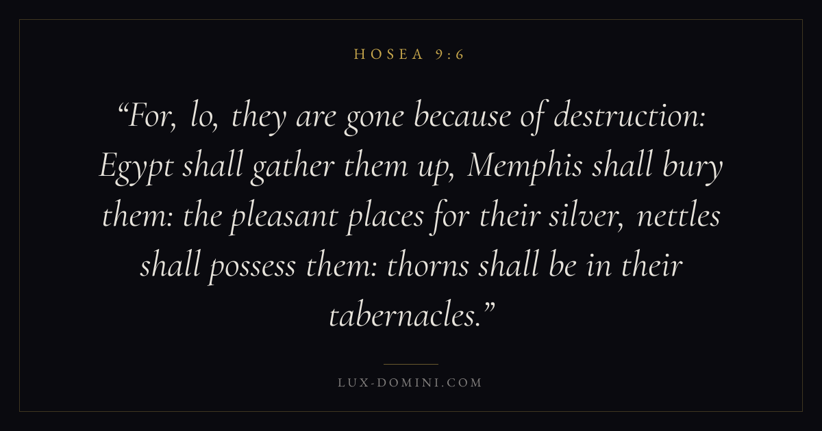 For, lo, they are gone because of destruction: Egypt shall gather them up, Memphis shall bury them: the pleasant places for their silver, nettles shall possess them: thorns shall be in their tabernacles.