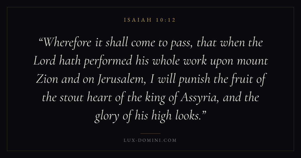 Wherefore it shall come to pass, that when the Lord hath performed his whole work upon mount Zion and on Jerusalem, I will punish the fruit of the stout heart of the king of Assyria, and the glory of his high looks.