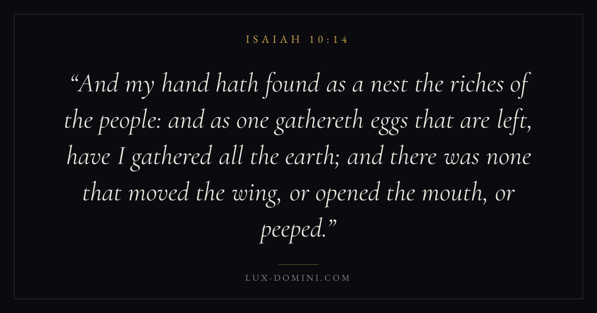 And my hand hath found as a nest the riches of the people: and as one gathereth eggs that are left, have I gathered all the earth; and there was none that moved the wing, or opened the mouth, or peeped.
