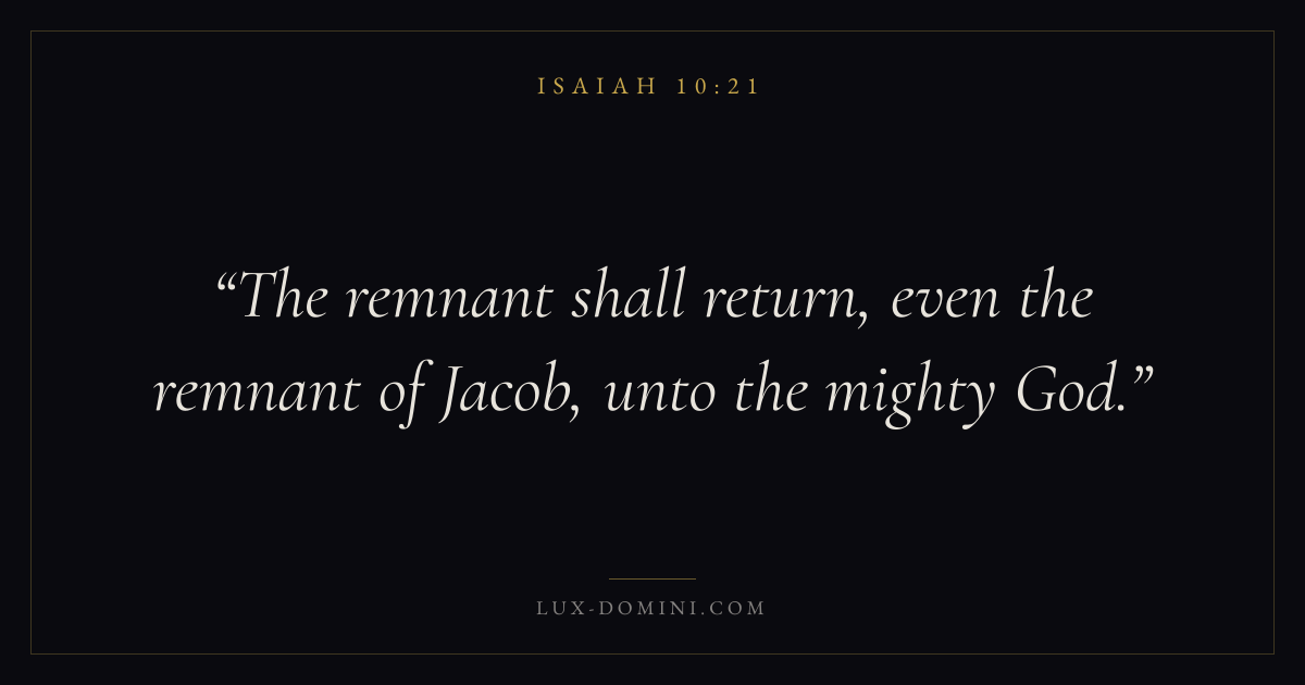 Books / Isaiah / Chapter 10 / Verse 21 ← Isaiah 10:20 Isaiah 10:21 Isaiah 10:22 → The remnant shall return, even the remnant of Jacob, unto the mighty God. Download verse card Share on Twitter Share on Facebook Pin it ✦ Key themes Justice and mercyTruthHolinessJudgment Read with Isaiah 10:20Isaiah 10:22Micah 6:8Amos 5:24 Related topics Bible verses about justice and mercyBible verses about truth ✦ Isaiah Chapter 10 verses V. 1 V. 2 V. 3 V. 4 V. 5 V. 6 V. 7 V. 8 V. 9 V. 10 V. 11 V. 12 V. 13 V. 14 V. 15 V. 16 V. 17 V. 18 V. 19 V. 20 V. 21 V. 22 V. 23 V. 24 V. 25 V. 26 V. 27 V. 28 V. 29 V. 30 V. 31 V. 32 V. 33 V. 34