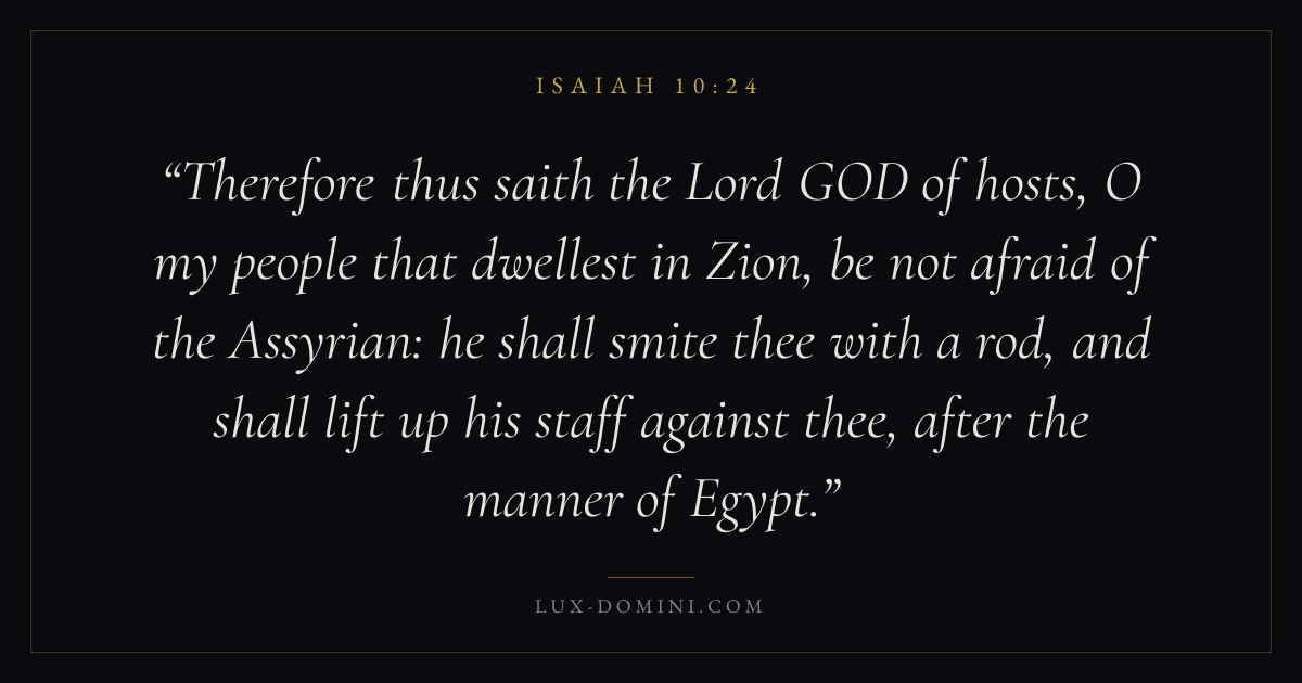 Therefore thus saith the Lord GOD of hosts, O my people that dwellest in Zion, be not afraid of the Assyrian: he shall smite thee with a rod, and shall lift up his staff against thee, after the manner of Egypt.