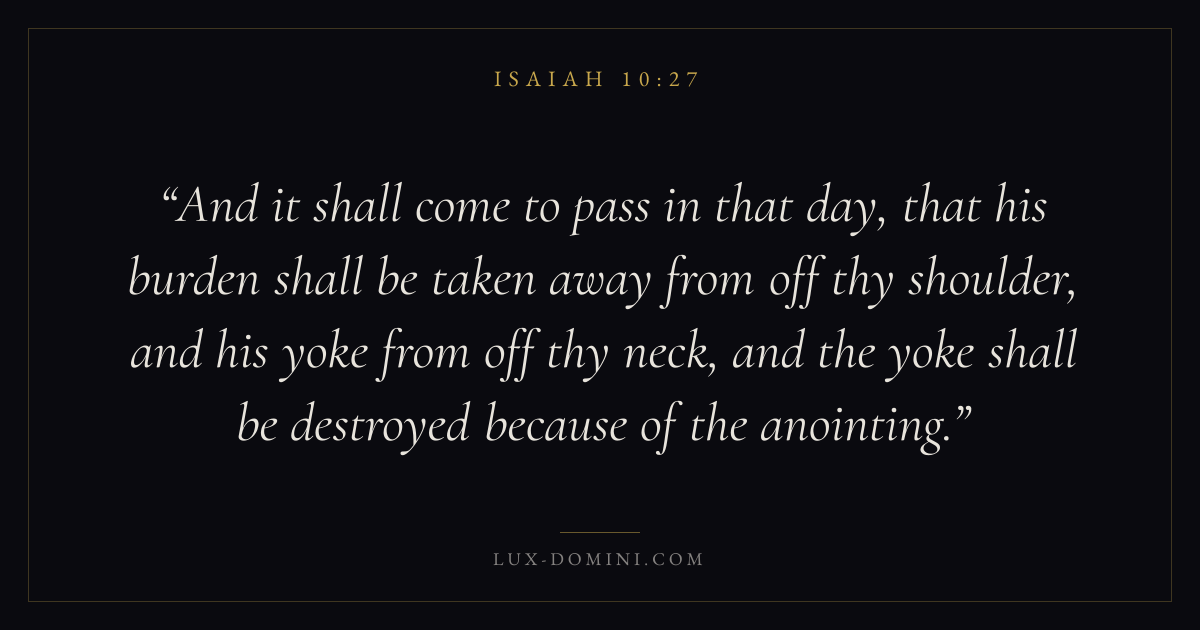 And it shall come to pass in that day, that his burden shall be taken away from off thy shoulder, and his yoke from off thy neck, and the yoke shall be destroyed because of the anointing.