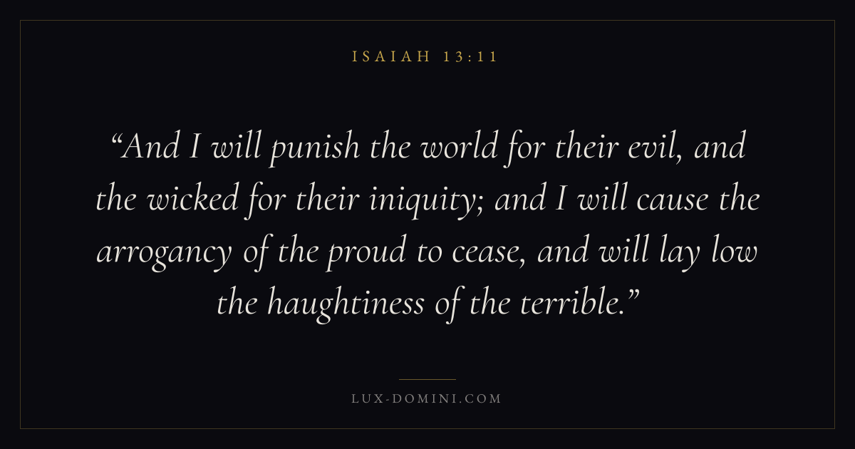 And I will punish the world for their evil, and the wicked for their iniquity; and I will cause the arrogancy of the proud to cease, and will lay low the haughtiness of the terrible.