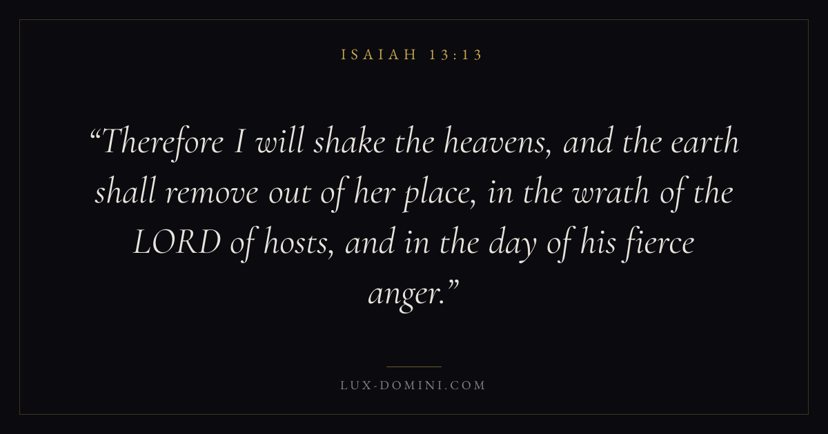 Therefore I will shake the heavens, and the earth shall remove out of her place, in the wrath of the LORD of hosts, and in the day of his fierce anger.