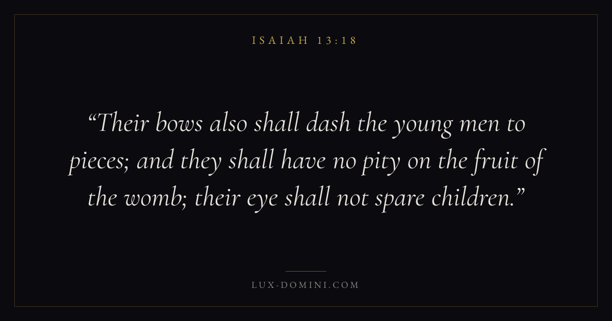 Their bows also shall dash the young men to pieces; and they shall have no pity on the fruit of the womb; their eye shall not spare children.