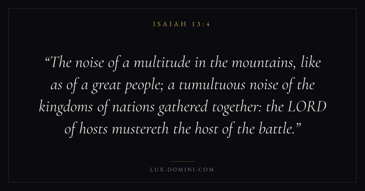 The noise of a multitude in the mountains, like as of a great people; a tumultuous noise of the kingdoms of nations gathered together: the LORD of hosts mustereth the host of the battle.