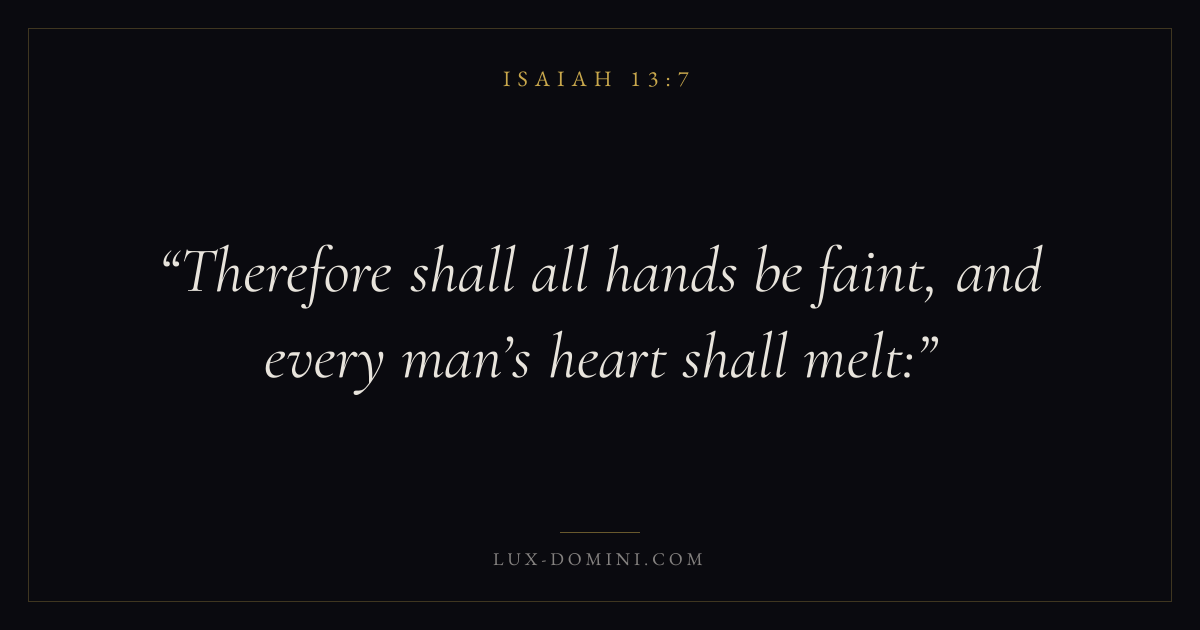 Books / Isaiah / Chapter 13 / Verse 7 ← Isaiah 13:6 Isaiah 13:7 Isaiah 13:8 → Therefore shall all hands be faint, and every man’s heart shall melt: Download verse card Share on Twitter Share on Facebook Pin it ✦ Key themes Justice and mercyPeaceHumilityHoliness Read with Isaiah 13:6Isaiah 13:8Micah 6:8Amos 5:24 Related topics Bible verses about justice and mercyBible verses about peaceBible verses about humility ✦ Isaiah Chapter 13 verses V. 1 V. 2 V. 3 V. 4 V. 5 V. 6 V. 7 V. 8 V. 9 V. 10 V. 11 V. 12 V. 13 V. 14 V. 15 V. 16 V. 17 V. 18 V. 19 V. 20 V. 21 V. 22